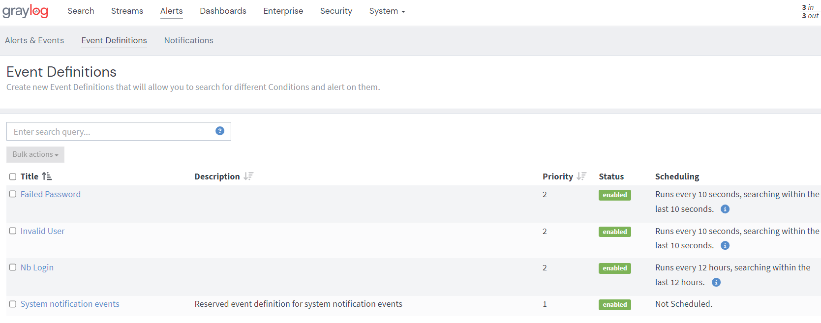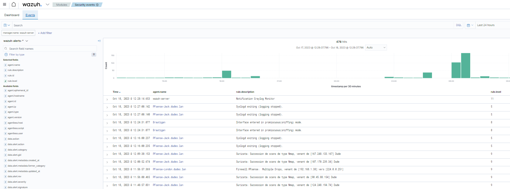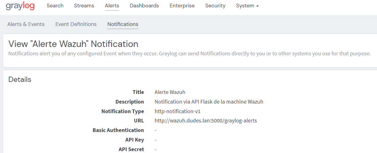 In order to relieve the Wazuh server, not all logs ingested by Graylog are forwarded to it, and the implementation of an alert mechanism (activated on a specific stream) notifies Wazuh only in the case of suspicious events (e.g. authentication errors).