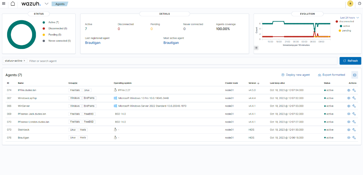 Hence, Wazuh will process filtered alerts coming from Graylog for every EndPoints from which logs are collected (including workstations or less sensitive apps for instance), while directly operating major EndPoints (FireWalls, Domain Controllers, …) through Wazuh Agent (allowing active responses). See below, Wazuh Dashboard with 7 EndPoints running Wazuh or OSSEC Agent.