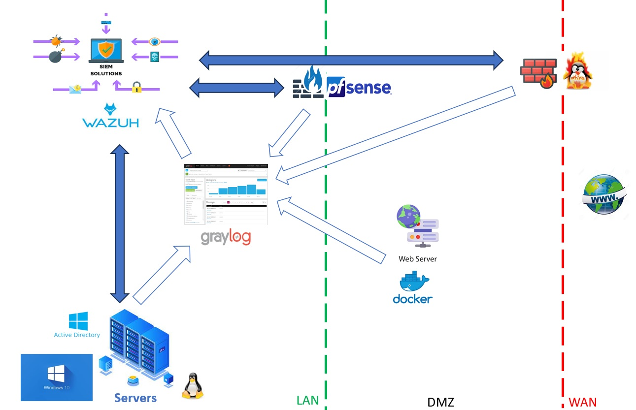 We have implemented Graylog and Wazuh within a Lab composed of several physical servers (Linux and Windows OS), application servers (Web, Mail, Docker,..), workstations (Linux and Windows OS) and two FireWalls (An IPfire instance serving as the external FireWall and a PFSense instance serving as the internal FireWall). This configuration allows us to demonstrate how to manage an heterogeneous IT Infrastructure.