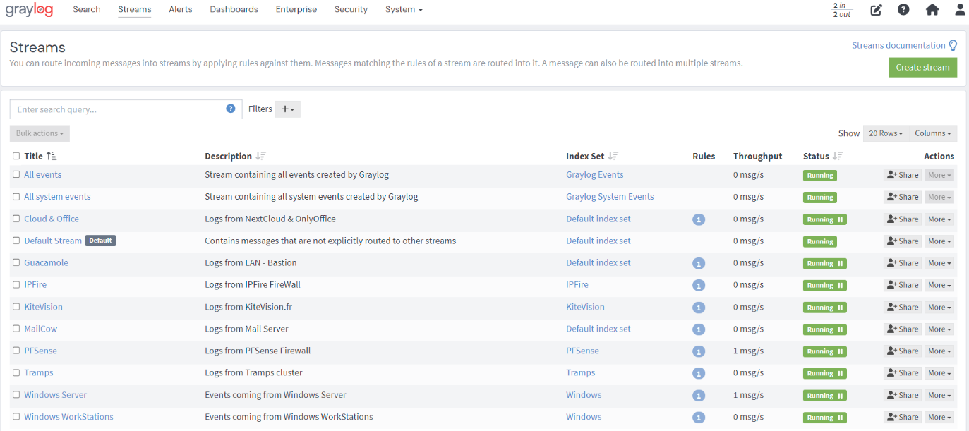 Graylog natively provides many capabilities for processing logs from devices using Syslog, and it can also ingest logs from specific devices like Palo Alto. For Windows EndPoints, additional agent is needed – as NxLOG for instance (see below).Graylog dashboards bring efficient monitoring of all incoming logs, and the ‘inputs’ and ‘streams’ functionalities allow you to define specific ports, protocols, and indices (equivalent to database tables in the OpenSearch terminology) for the ingestion of logs from each device or group of devices. For each indice, log rotation can be specified (on time period or on file size criteria).